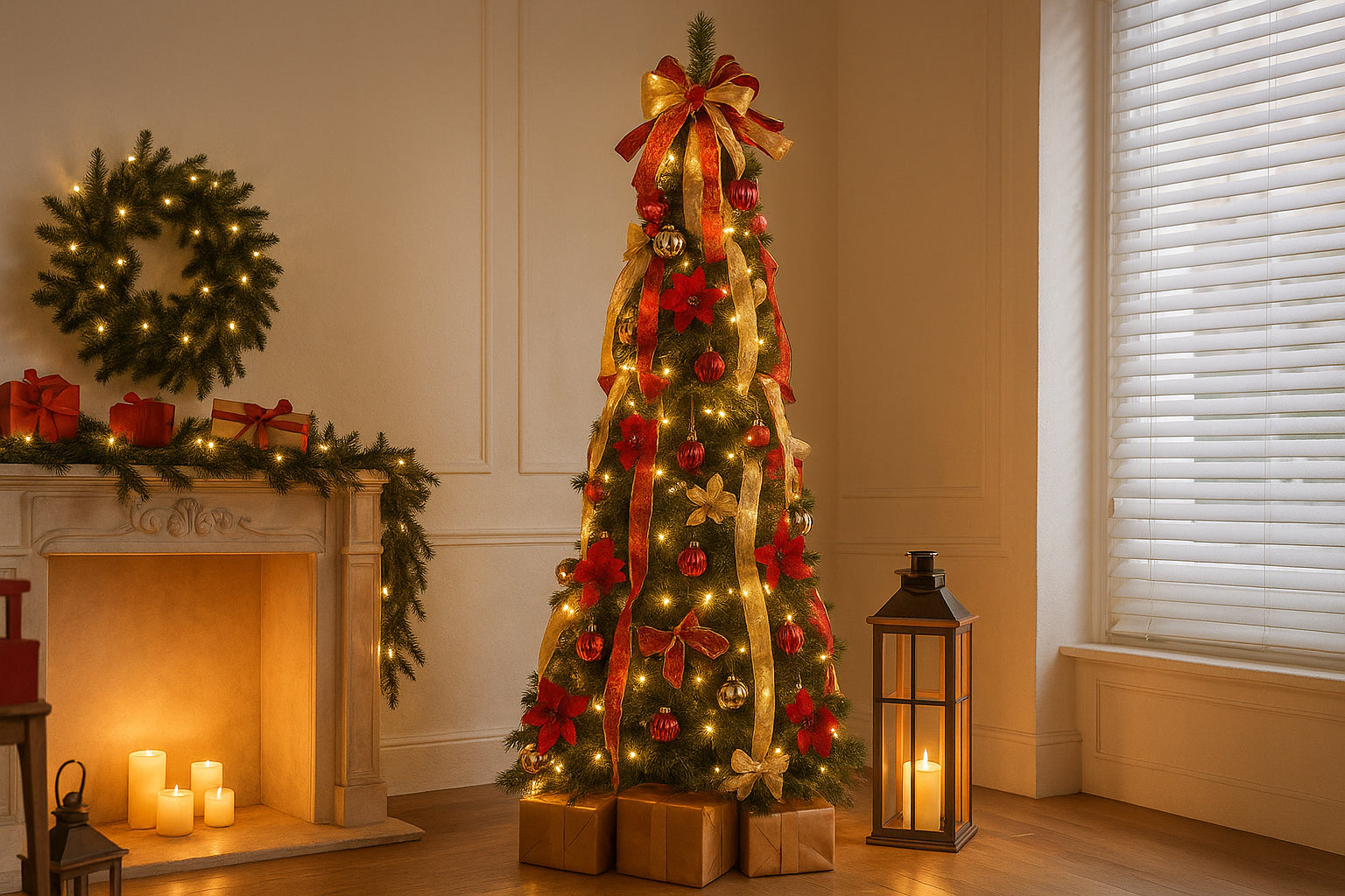 Wystarczy ustawić podstawę, wsunąć maszt i opuścić drzewko – wszystkie ozdoby oraz światła LED są już na swoim miejscu.