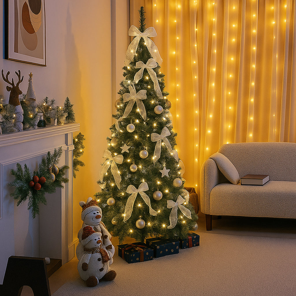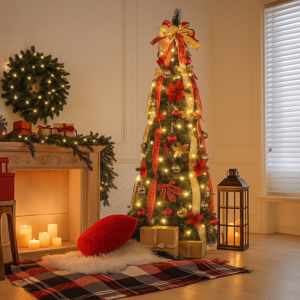 W zestawie znajdują się dopasowane kolorystycznie ozdoby, wstążki, kokardy oraz ciepłe światła LED z ośmioma trybami świecenia.